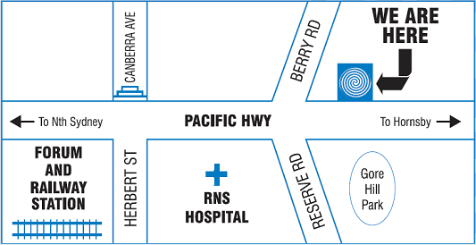 Driving (via the Pacific Hwy): turn into Berry Road (in St Leonards, NOT North Sydney), opposite RNS Hospital. There is 1-hour & 2-hour meter parking in Berry Road. You can also use the RNS multi-storey carpark, entering via Herbert or Westbourne Street .